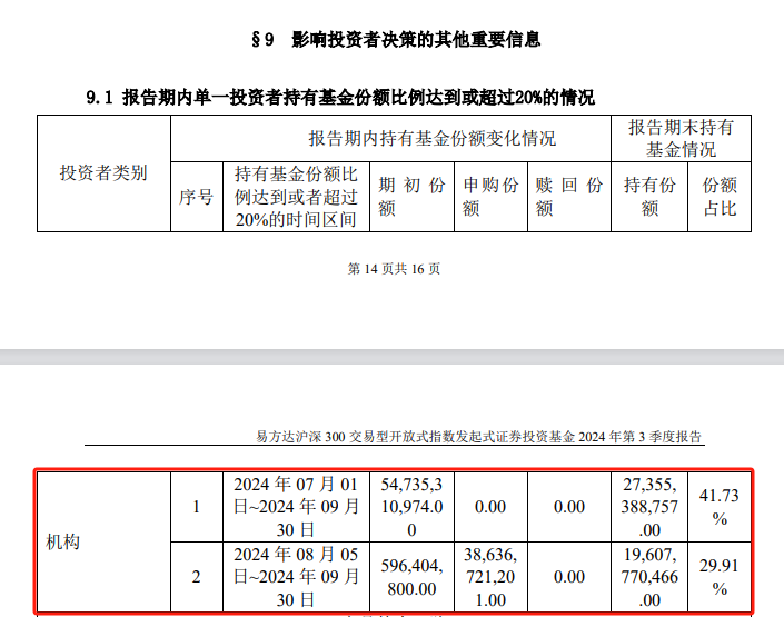 易方达沪深300ETF三季报显示,第一位机构投资者期初持有547.35亿份的基金份额,三季度没有申购和赎回操作;在9月20日该只ETF曾进行份额合并,合并后该机构持有份额273.55亿份。按照单位净值计算,该机构三季度末持有规模为1099亿元。