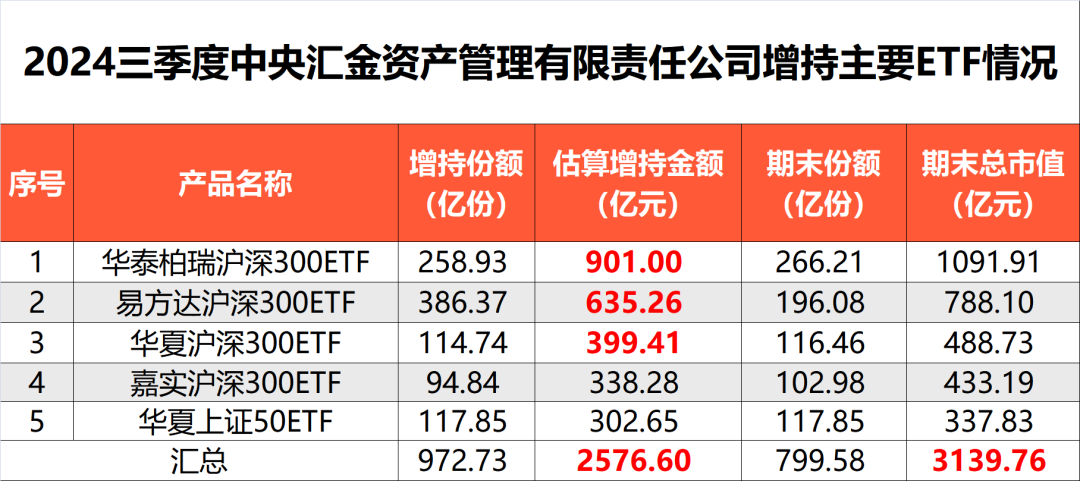 根据公开信息测算,从2024年三季末数据看,中央汇金资产大举增持主流ETF近千亿份,估算增持金额超2500亿元。