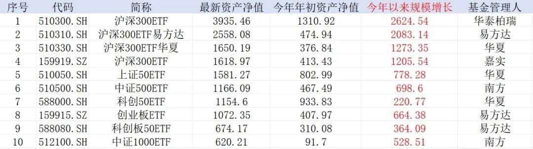 截至10月23日,共有4只ETF今年以来规模增长超1000亿元,其中华泰柏瑞沪深300ETF、沪深300ETF易方达(510310.SH)今年以来规模分别增加2624.54亿元、2083.14亿元。