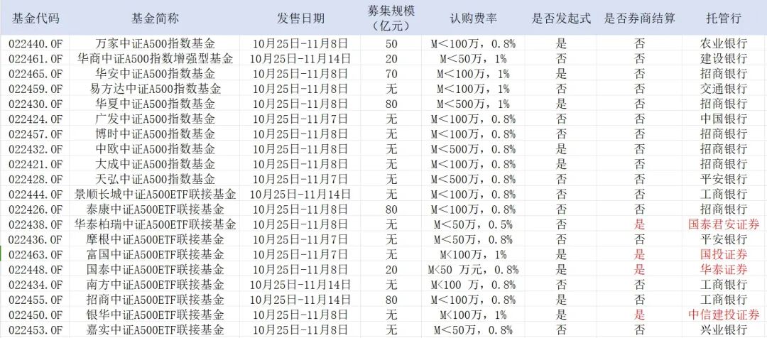 图:25日发行的20只中证A500指数基金中,有4只采取了券商结算的模式来源:基金公告界面新闻整理