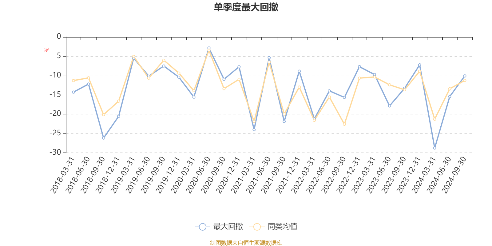 截至10月25日,基金近三年最大回撤为33.96%,同类可比基金排名41/41。其中,单季度最大回撤出现在2024年一季度,为28.8%。