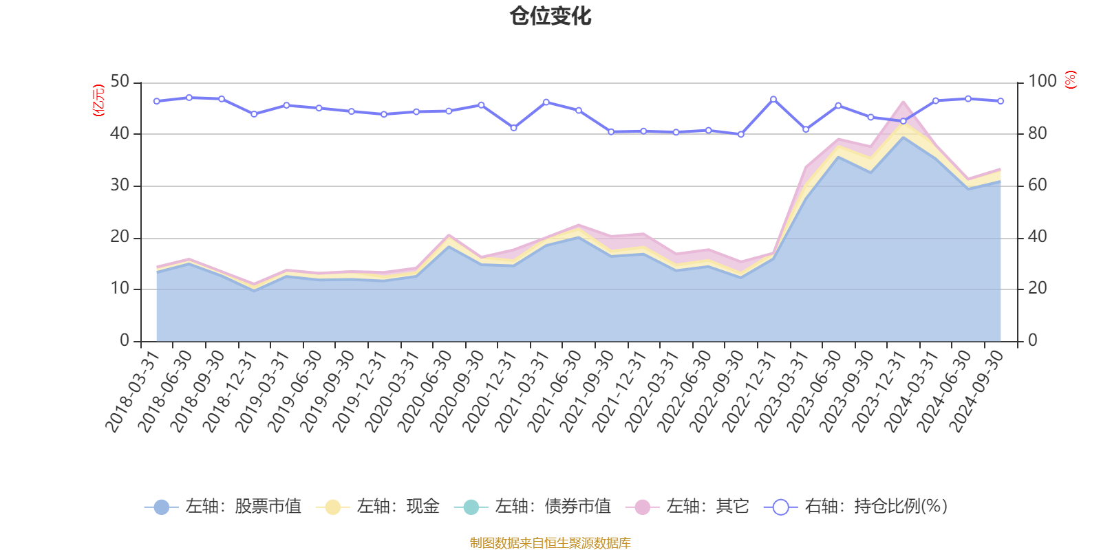 据定期报告数据统计,近三年平均股票仓位为86.77%,同类平均为87.88%。2018年上半年末基金达到94.16%的最高仓位,2022年三季度末最低,为79.98%。