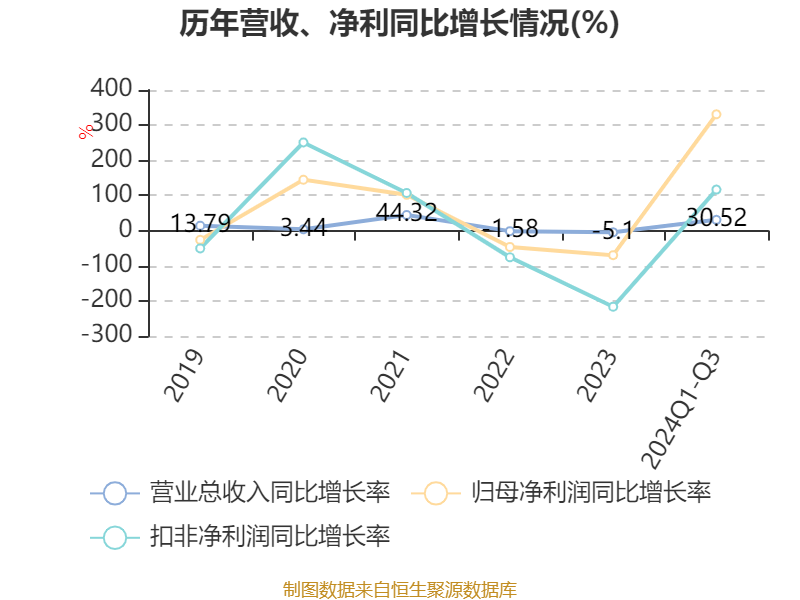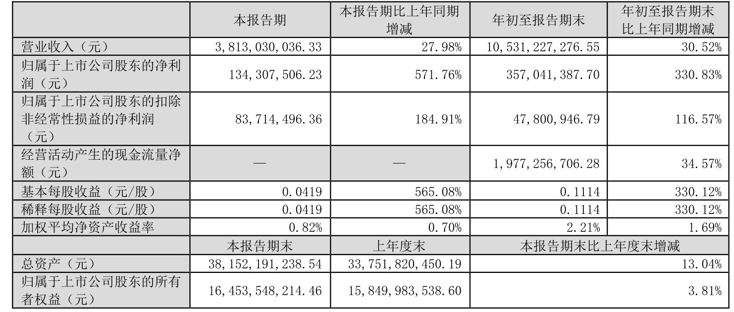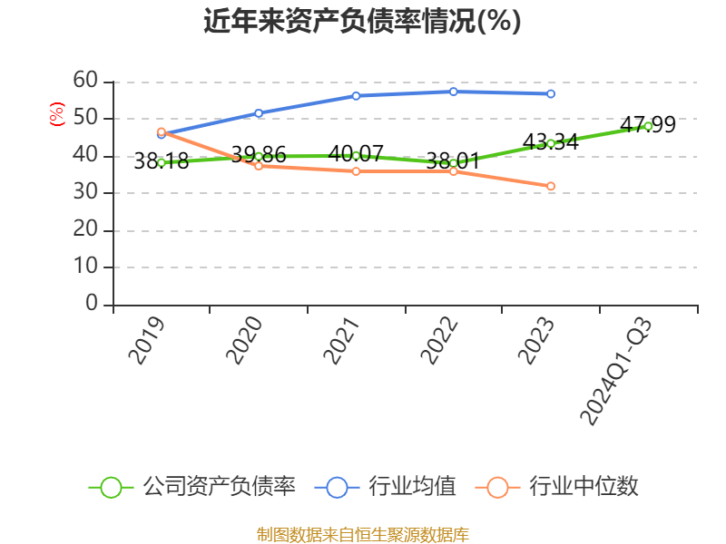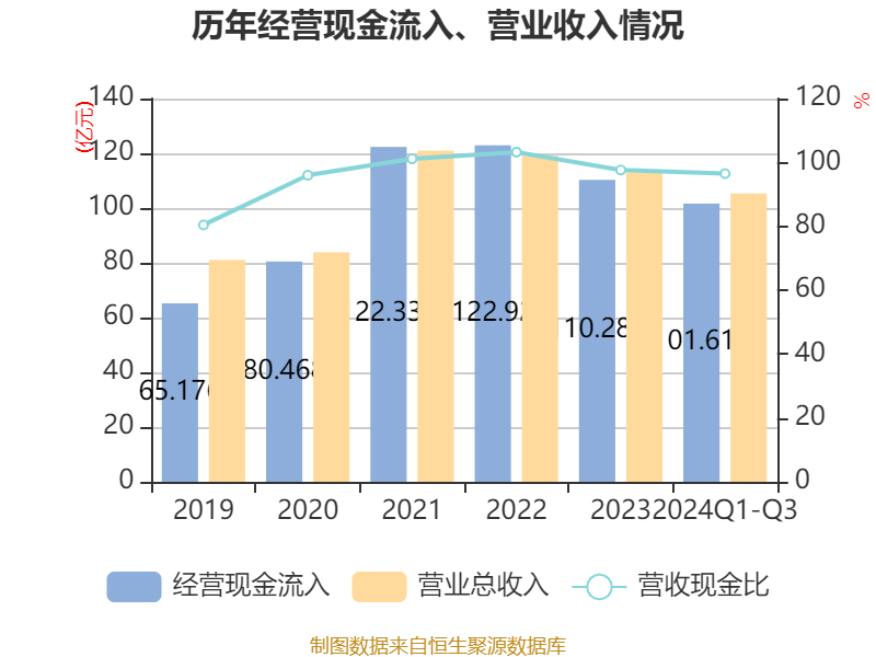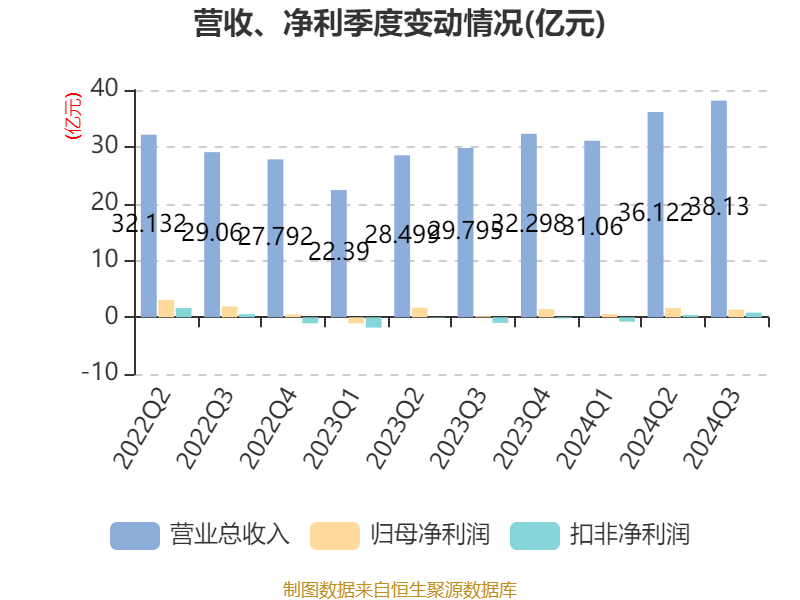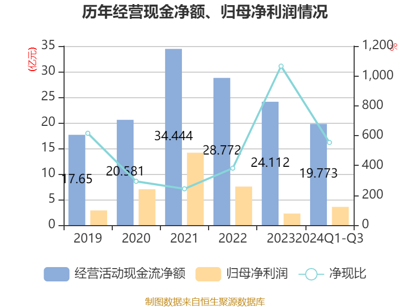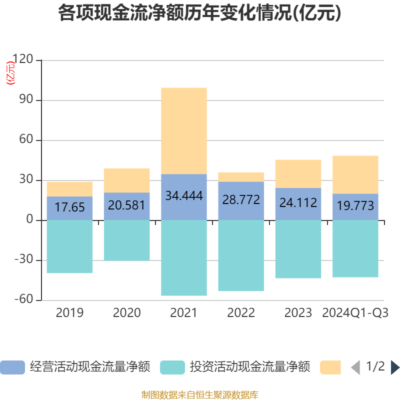 2024年前三季度,公司经营活动现金流净额为19.77亿元,同比增长34.57%;筹资活动现金流净额28.39亿元,同比增加12.48亿元;投资活动现金流净额-42.97亿元,上年同期为-31.94亿元。