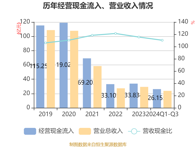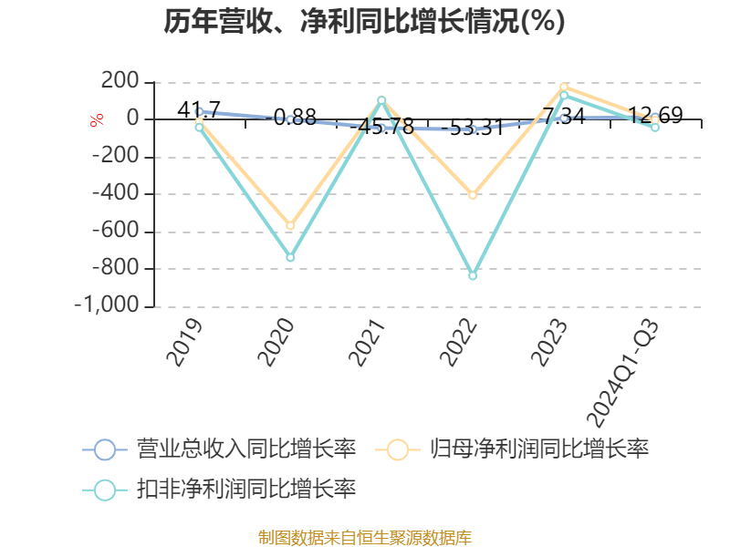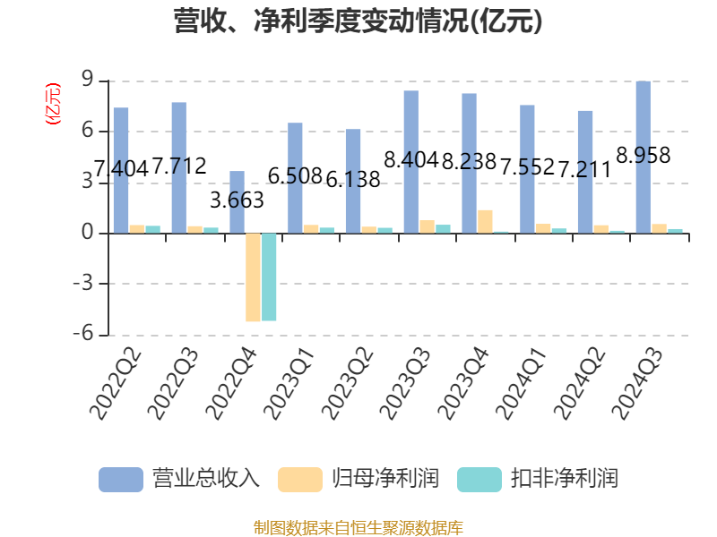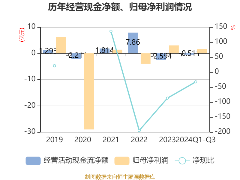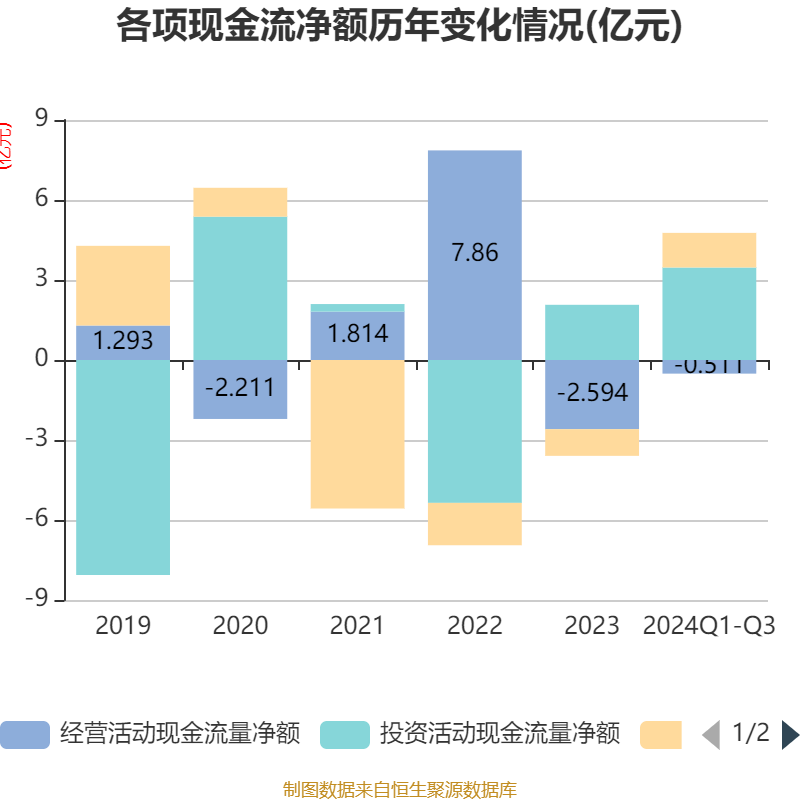 2024年前三季度,公司经营活动现金流净额为-5107.9万元,同比增加2.84亿元;筹资活动现金流净额1.3亿元,同比增加2.16亿元;投资活动现金流净额3.47亿元,上年同期为1.68亿元。