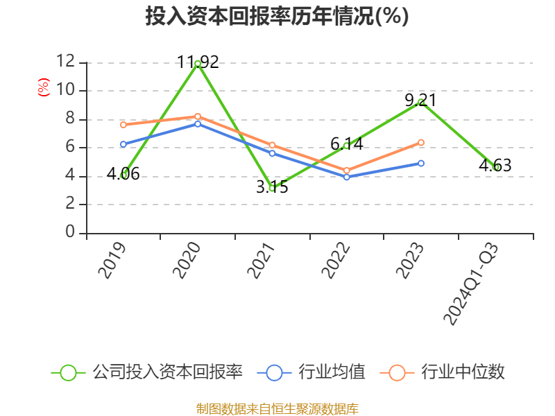 盈利能力方面, 2024年前三季度公司加权平均净资产收益率为5.09%,同比下降3.01个百分点。公司2024年前三季度投入资本回报率为4.63%,较上年同期下降2.72个百分点。