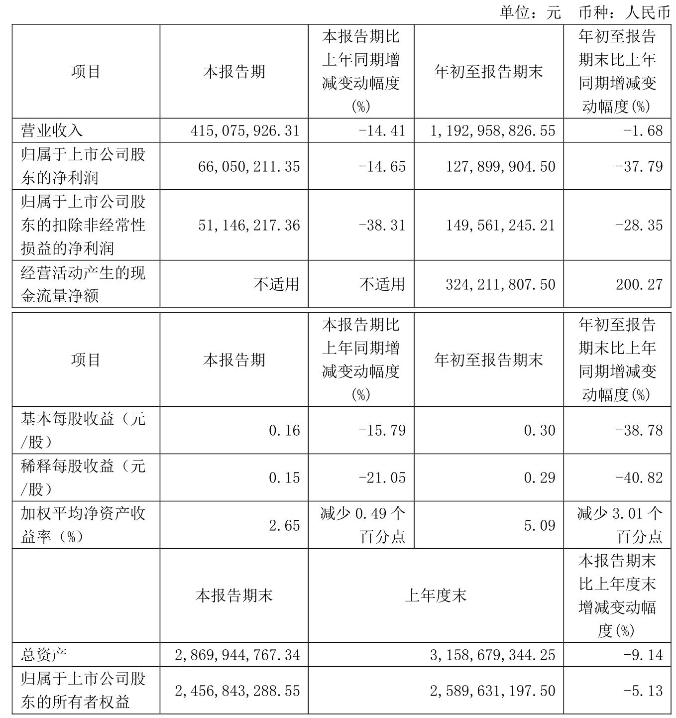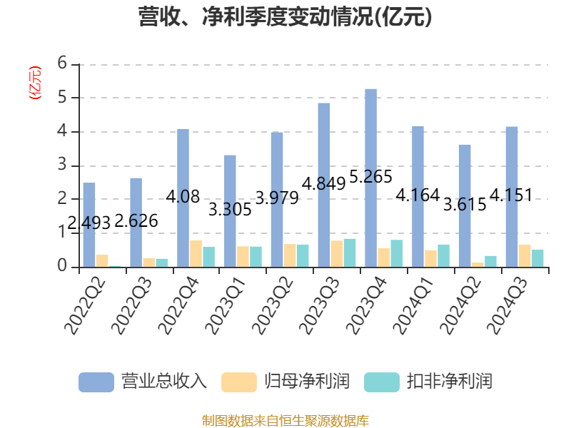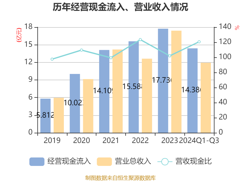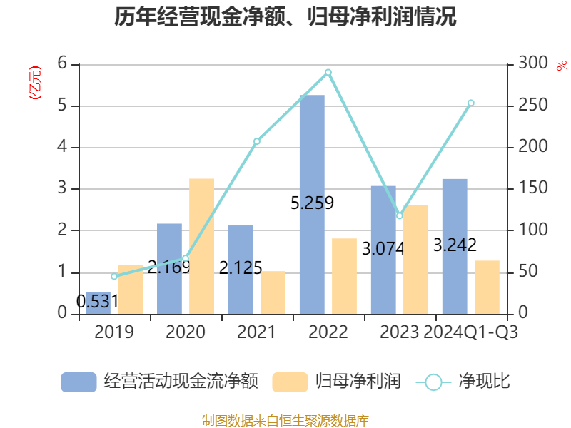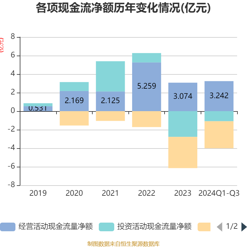 2024年前三季度,公司经营活动现金流净额为3.24亿元,同比增长200.27%;筹资活动现金流净额-2.92亿元,同比减少355.81万元;投资活动现金流净额-1.09亿元,上年同期为-2.12亿元。