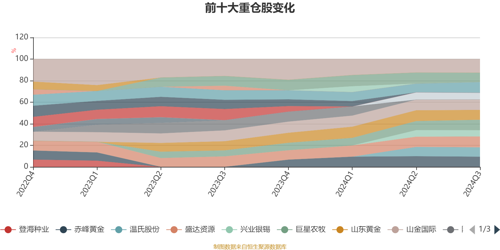 该基金持股集中度较高,近2年前十大重仓股集中度长期超过60%。截至2024年三季度末,基金十大重仓股分别是盛达资源、荃银高科、巨星农牧、山金国际、赤峰黄金、山东黄金、温氏股份、中金黄金、湖南黄金、兴业银锡。