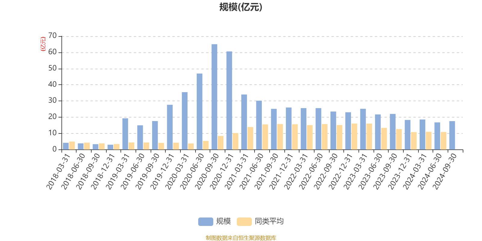 截至2024年三季度末,基金规模为17.55亿元,在同类可比基金中排名3/91,在偏股型基金排名52/2350。