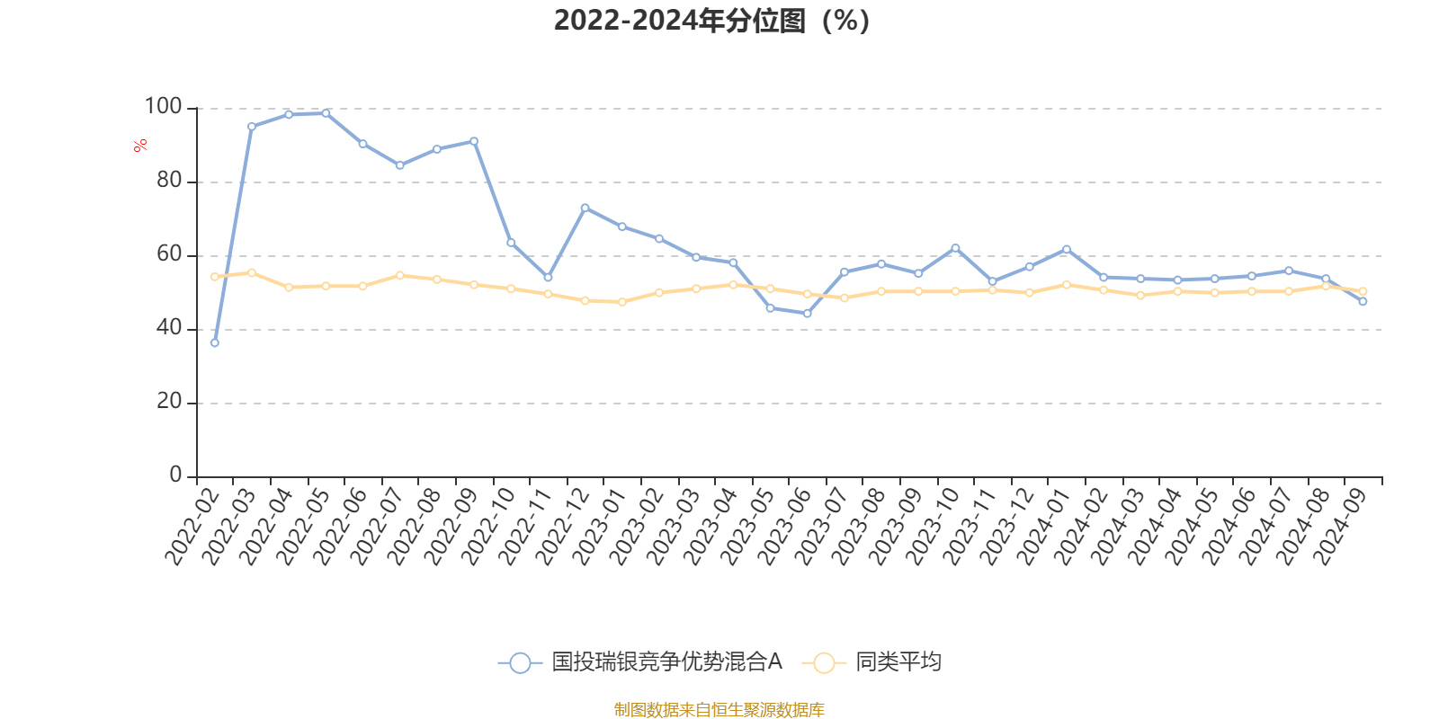 通过所选区间该基金净值增长率分位图,可以观察该基金与同类基金业绩比较情况。图为坐标原点到区间内某时点的净值增长率在同类基金中的分位数。