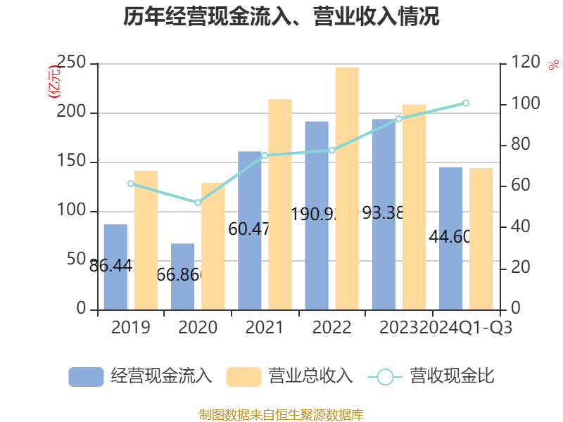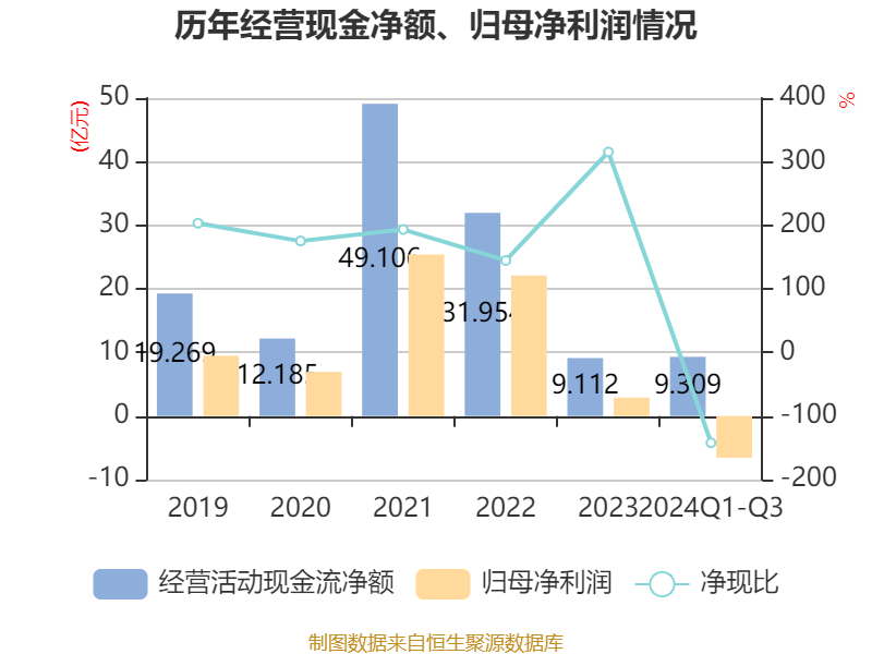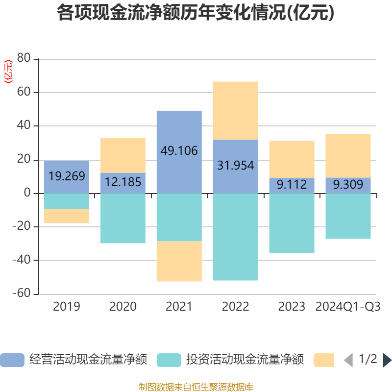 2024年前三季度,公司经营活动现金流净额为9.31亿元,同比增长349.2%;筹资活动现金流净额25.92亿元,同比增加11.62亿元;投资活动现金流净额-27.08亿元,上年同期为-18.25亿元。