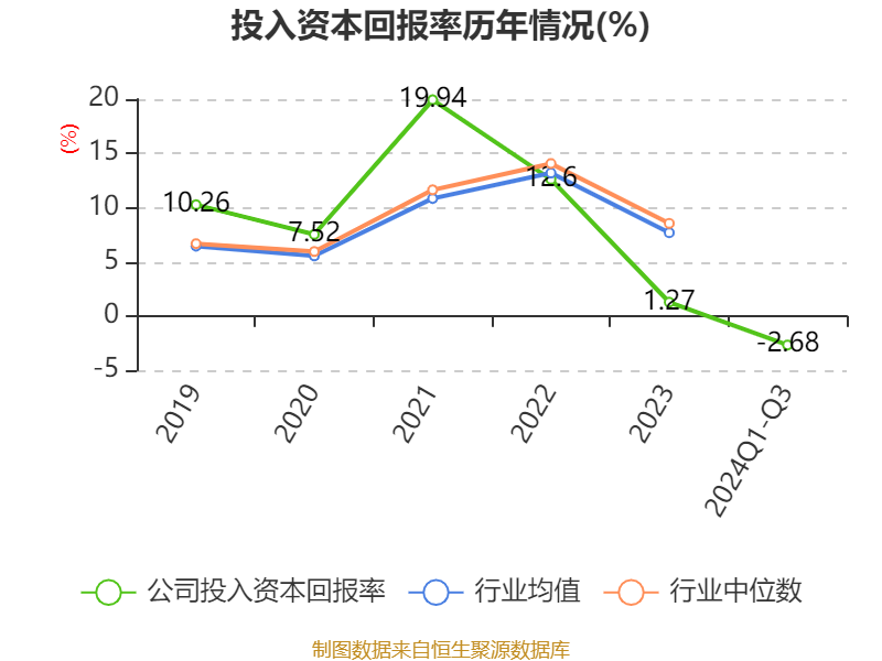 盈利能力方面, 2024年前三季度公司加权平均净资产收益率为-4.48%,同比下降7.23个百分点。公司2024年前三季度投入资本回报率为-2.68%,较上年同期下降4.86个百分点。