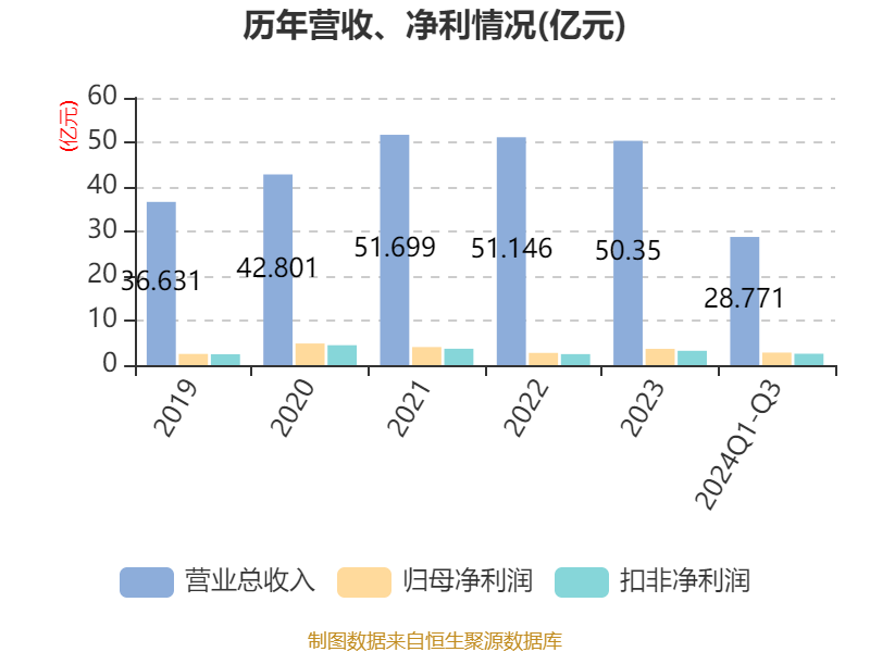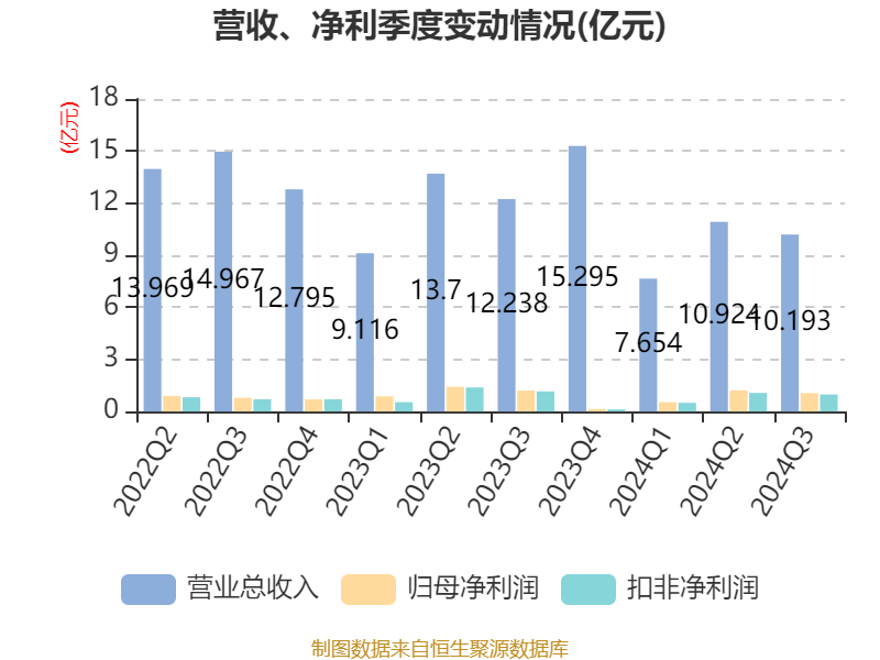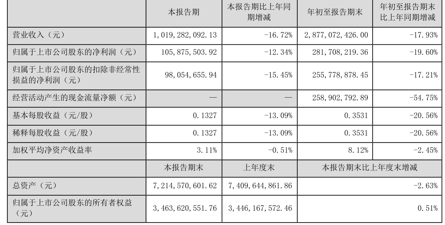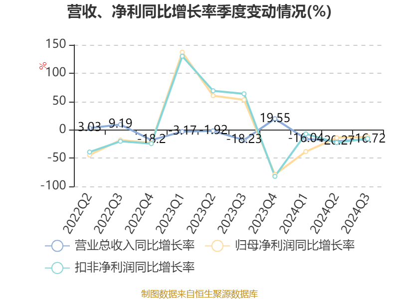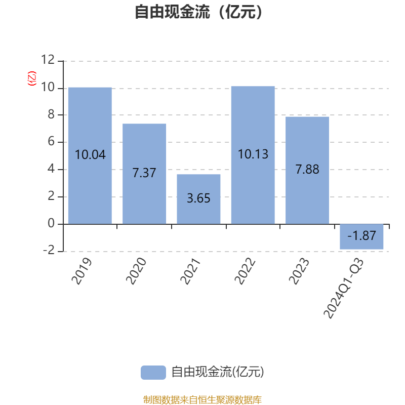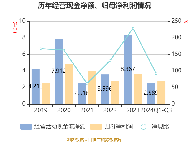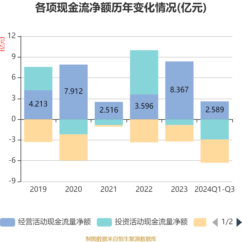 2024年前三季度,公司经营活动现金流净额为2.59亿元,同比下降54.75%;筹资活动现金流净额-3.37亿元,同比减少7474.35万元;投资活动现金流净额-2.92亿元,上年同期为-4960.86万元。