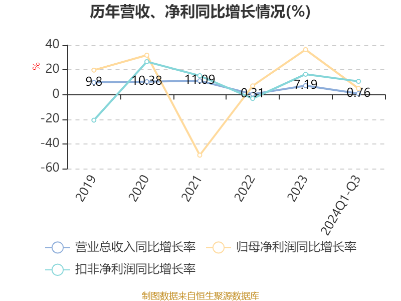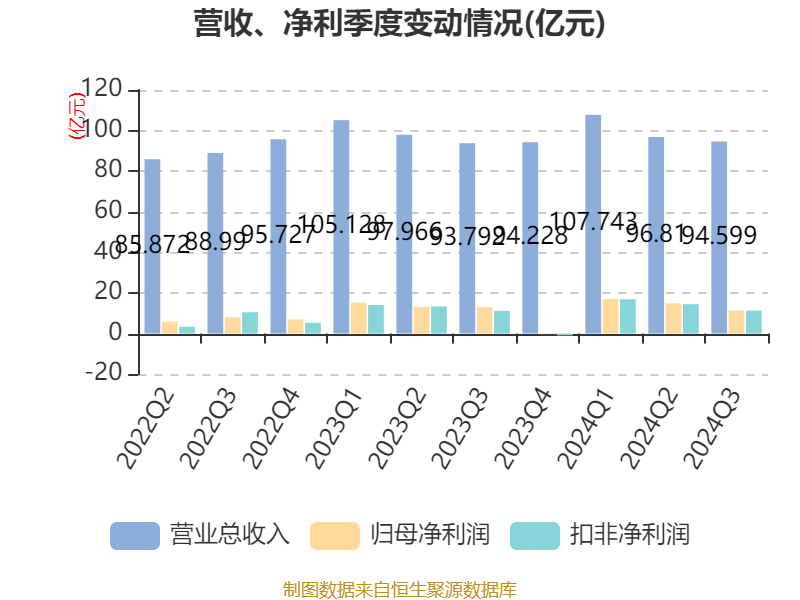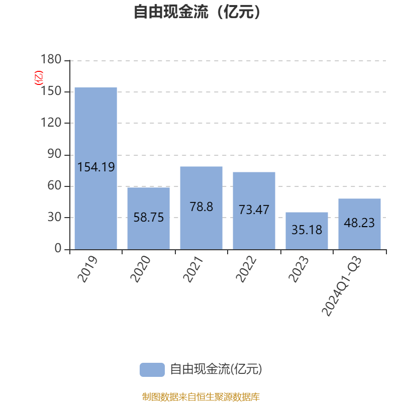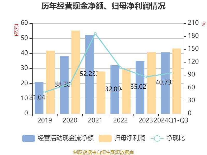 2024年前三季度,公司经营活动现金流净额为40.73亿元,同比增长57.29%;筹资活动现金流净额-36.62亿元,同比减少5.31亿元;投资活动现金流净额-11.58亿元,上年同期为5.34亿元。