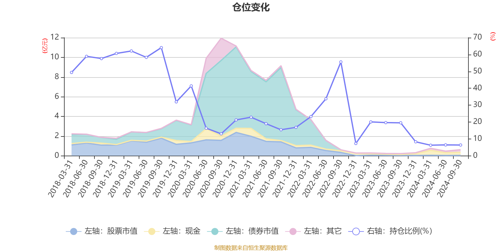 据定期报告数据统计,近三年平均股票仓位为18.61%,同类平均为40.52%。2019年三季度末基金达到64.09%的最高仓位,2024年一季度末最低,为6.26%。