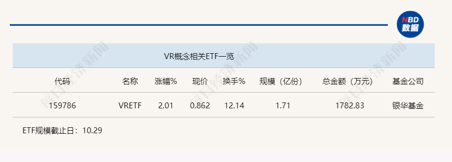 10月30日上午,两市热点分散,VRETF(159786)表现相较突出,半日涨幅达2.01%,领涨整个行业ETF市场。