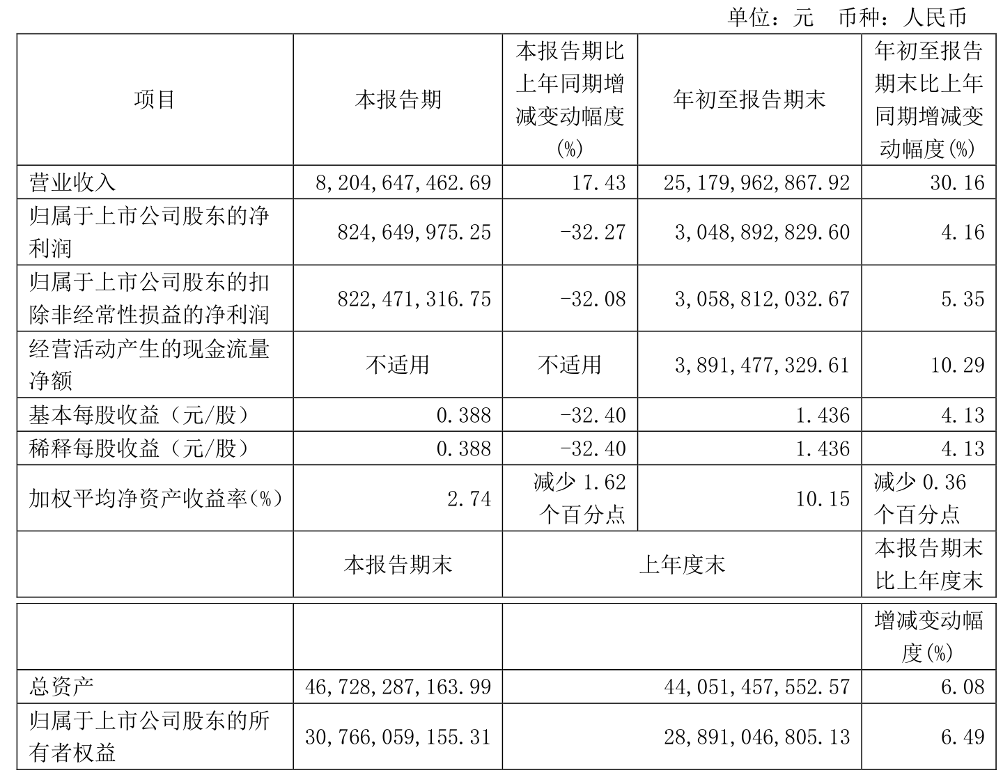 2024年前三季度,公司经营活动现金流净额为38.91亿元,同比增长10.29%;筹资活动现金流净额-3.67亿元,同比减少24.8亿元;投资活动现金流净额-35.92亿元,上年同期为-59.05亿元。