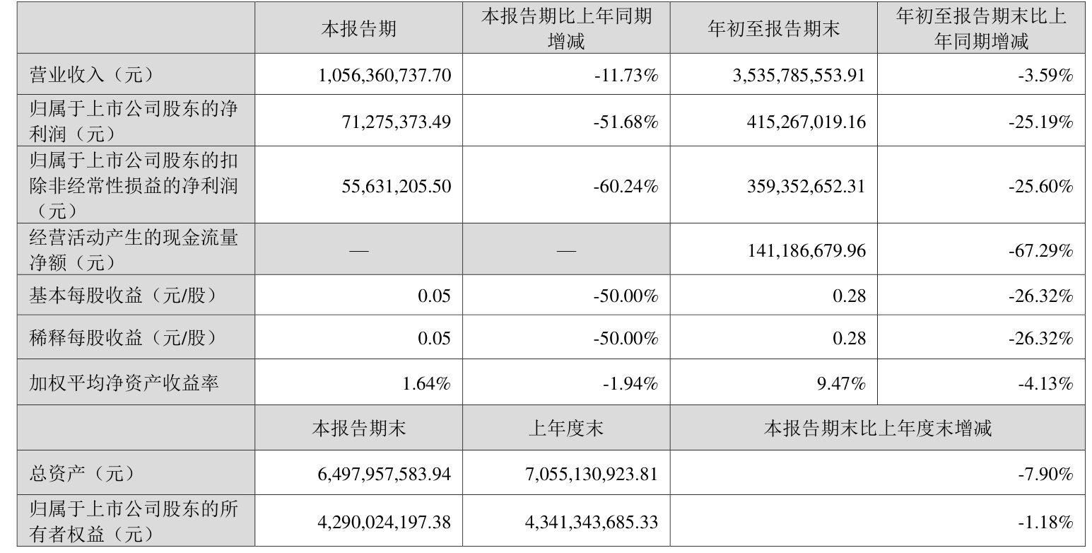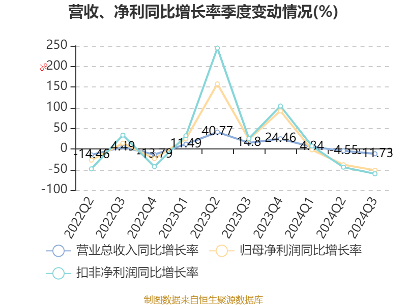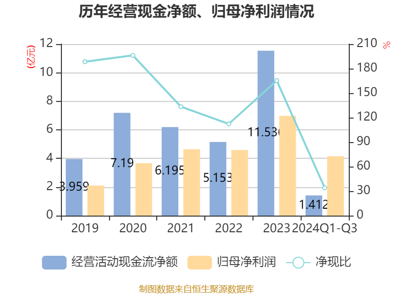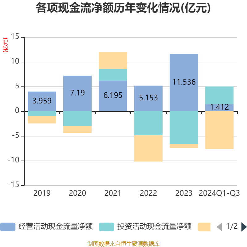 2024年前三季度,公司经营活动现金流净额为1.41亿元,同比下降67.29%;筹资活动现金流净额-7.63亿元,同比减少7.08亿元;投资活动现金流净额3.56亿元,上年同期为-5.58亿元。