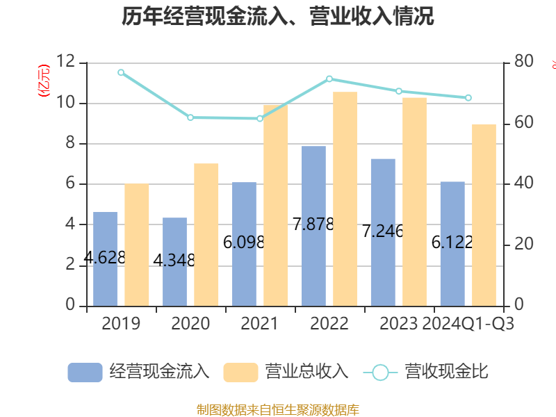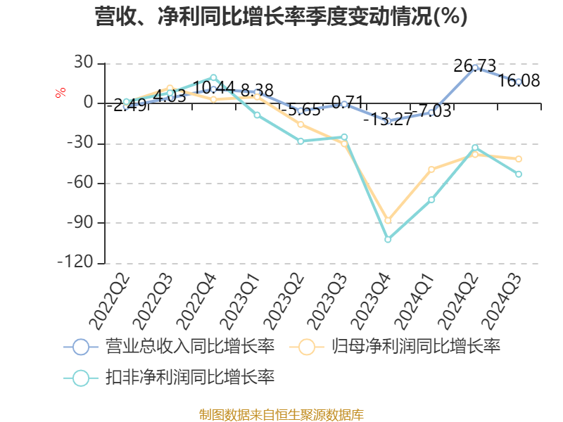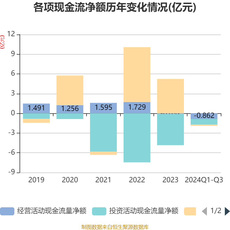 2024年前三季度,公司经营活动现金流净额为-8620.75万元,同比减少2551.95万元;筹资活动现金流净额-1901.97万元,同比减少4.31亿元;投资活动现金流净额-8528.51万元,上年同期为-5.73亿元。