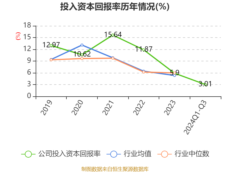 盈利能力方面, 2024年前三季度公司加权平均净资产收益率为3.44%,同比下降2.85个百分点。公司2024年前三季度投入资本回报率为3.01%,较上年同期下降2.62个百分点。