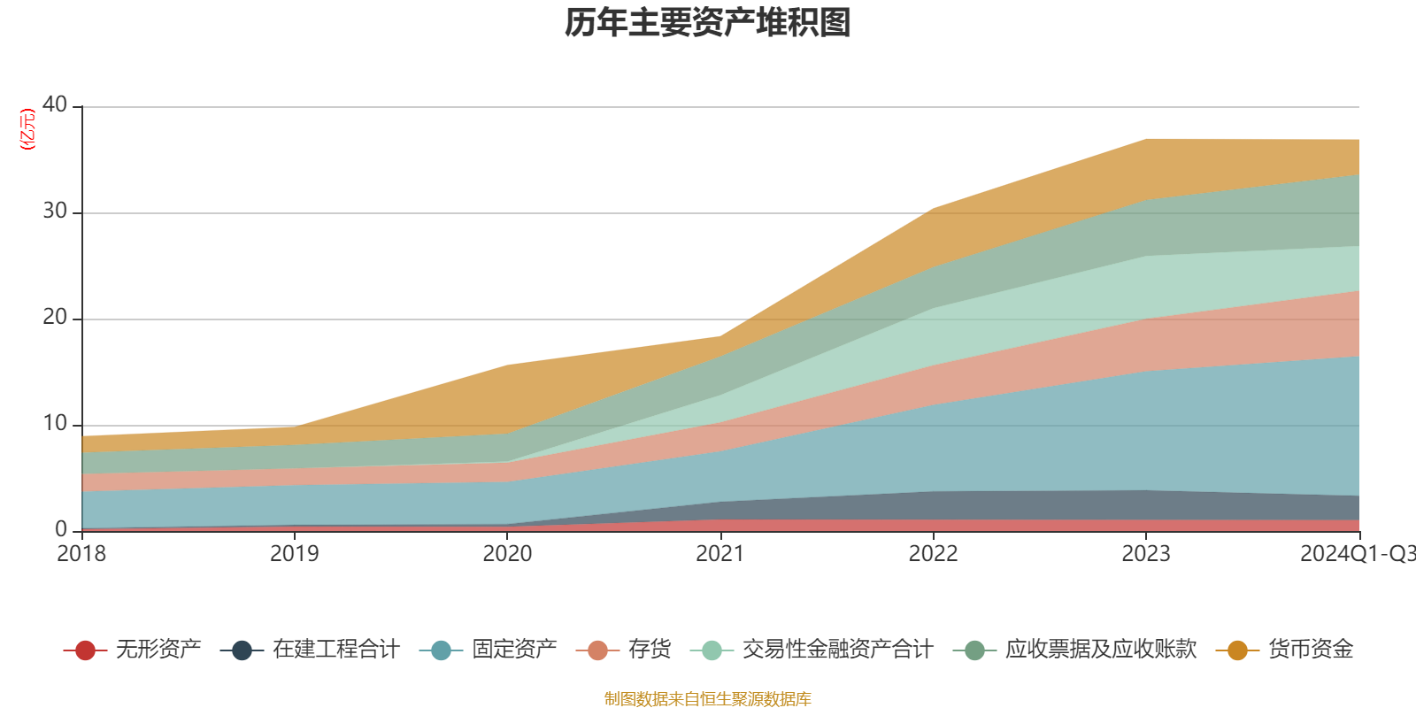 资产重大变化方面,截至2024年三季度末,公司货币资金较上年末减少42.7%,占公司总资产比重下降6.47个百分点;交易性金融资产合计较上年末减少28.88%,占公司总资产比重下降4.57个百分点;固定资产较上年末增加17.12%,占公司总资产比重上升4.38个百分点;应收票据及应收账款较上年末增加27.41%,占公司总资产比重上升3.44个百分点。