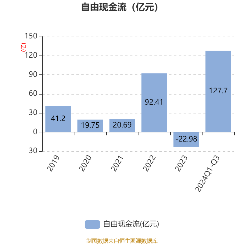 2024年前三季度,公司经营活动现金流净额为114.35亿元,同比增长56.56%;筹资活动现金流净额-56.84亿元,同比减少14.59亿元;投资活动现金流净额14.02亿元,上年同期为-110.45亿元。