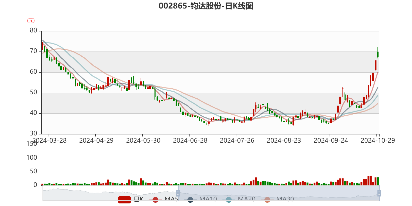 以10月30日收盘价计算,钧达股份目前市盈率(TTM)约为-13.39倍,市净率(LF)约4.12倍,市销率(TTM)约1.33倍。