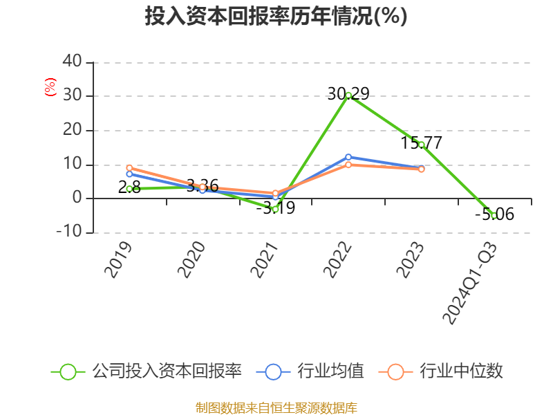 盈利能力方面, 2024年前三季度公司加权平均净资产收益率为-9.55%,同比下降68.22个百分点。公司2024年前三季度投入资本回报率为-5.06%,较上年同期下降33.6个百分点。