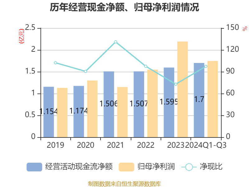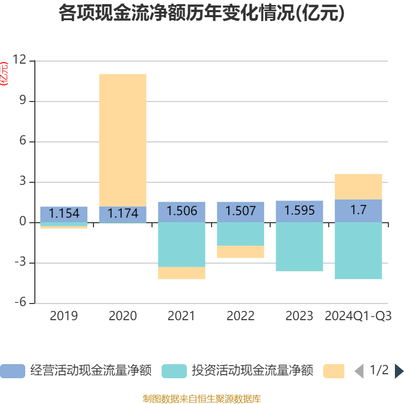 2024年前三季度,公司经营活动现金流净额为1.7亿元,同比增长77.88%;筹资活动现金流净额1.88亿元,同比增加1.98亿元;投资活动现金流净额-4.23亿元,上年同期为-4.67亿元。