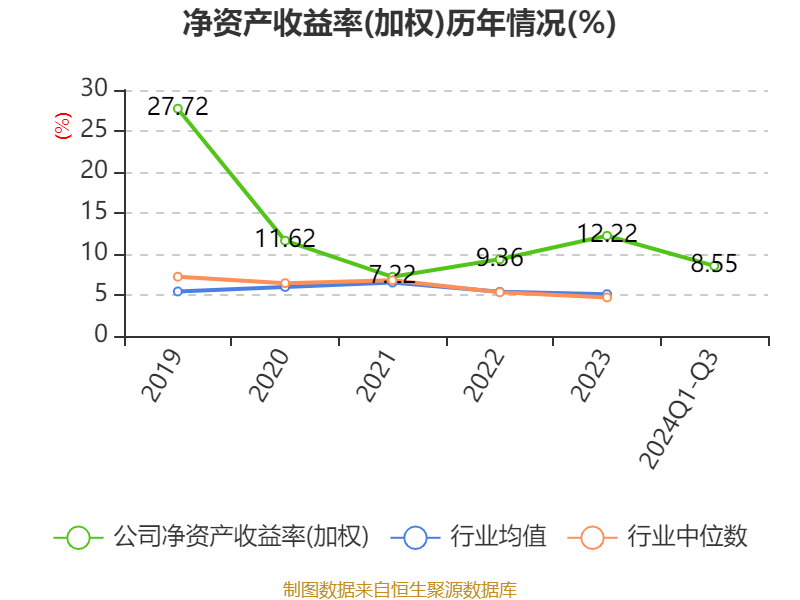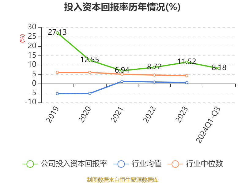 盈利能力方面, 2024年前三季度公司加权平均净资产收益率为8.55%,同比下降0.25个百分点。公司2024年前三季度投入资本回报率为8.18%,较上年同期下降0.12个百分点。