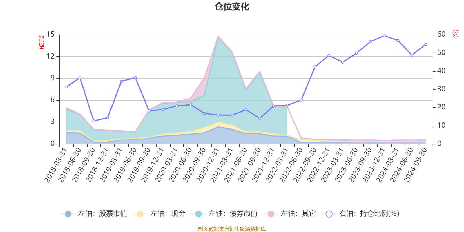 据定期报告数据统计,近三年平均股票仓位为44.04%,同类平均为79.68%。2023年末基金达到59.5%的最高仓位,2018年三季度末最低,为12.63%。