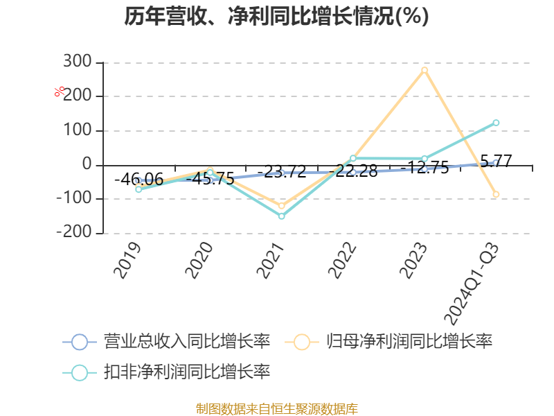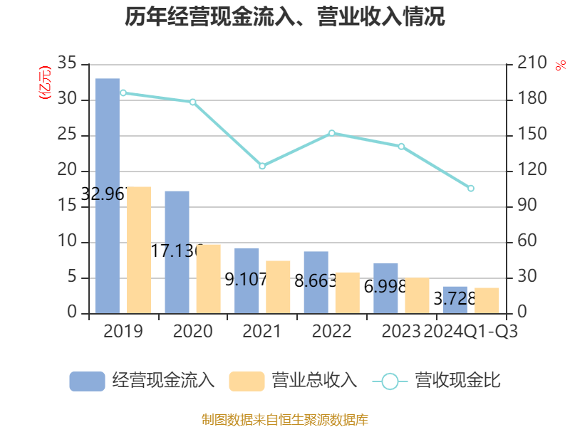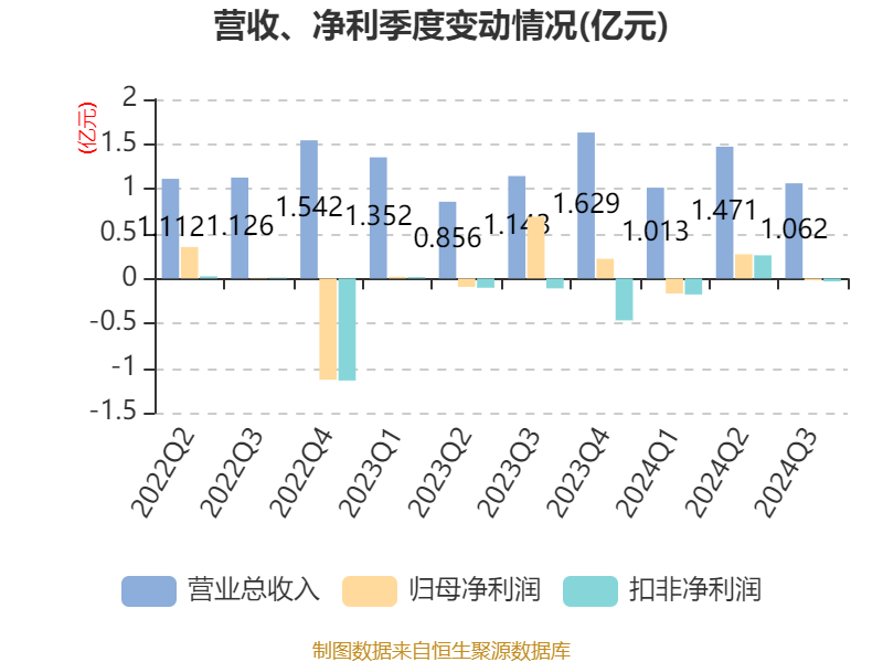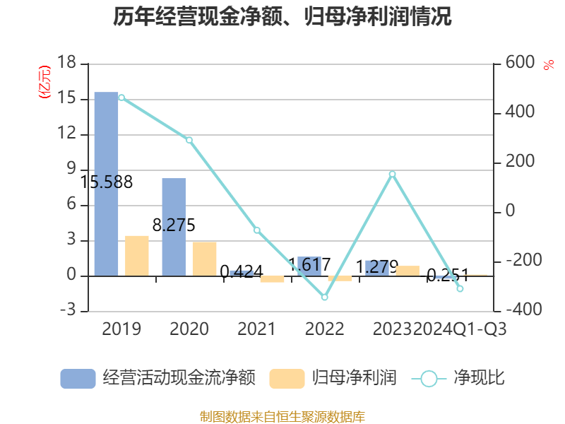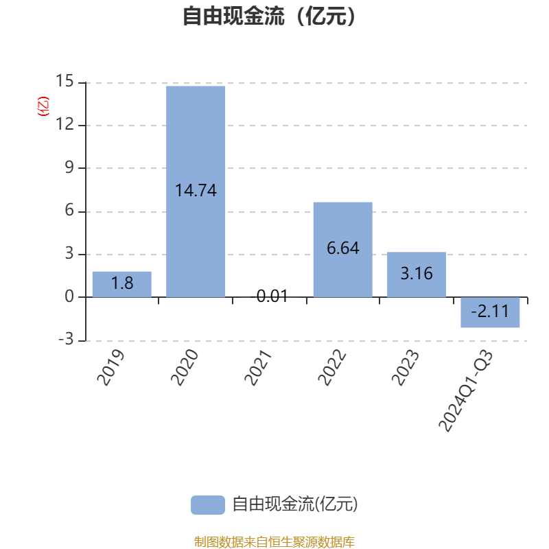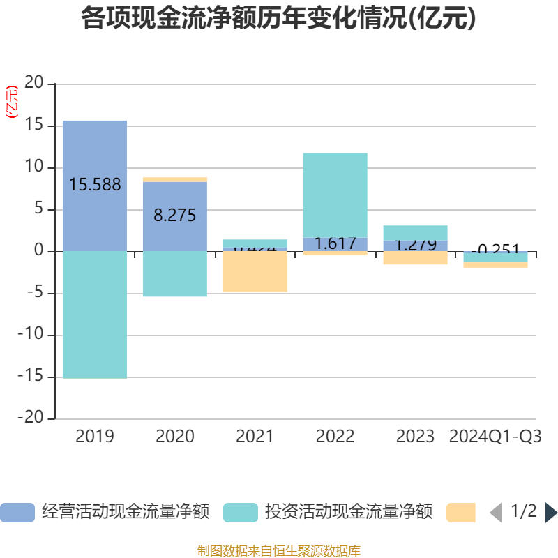 2024年前三季度,公司经营活动现金流净额为-2508.09万元,同比减少1.37亿元;筹资活动现金流净额-6324.95万元,同比增加9722.8万元;投资活动现金流净额-1.1亿元,上年同期为2.49亿元。