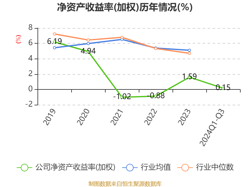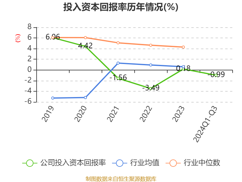 盈利能力方面, 2024年前三季度公司加权平均净资产收益率为0.15%,同比下降1.02个百分点。公司2024年前三季度投入资本回报率为-0.99%,较上年同期下降0.95个百分点。