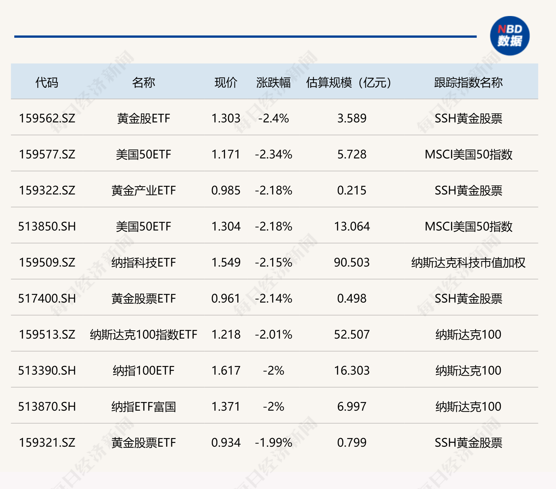 下跌方面,黄金股、美国50等ETF跌逾2%。