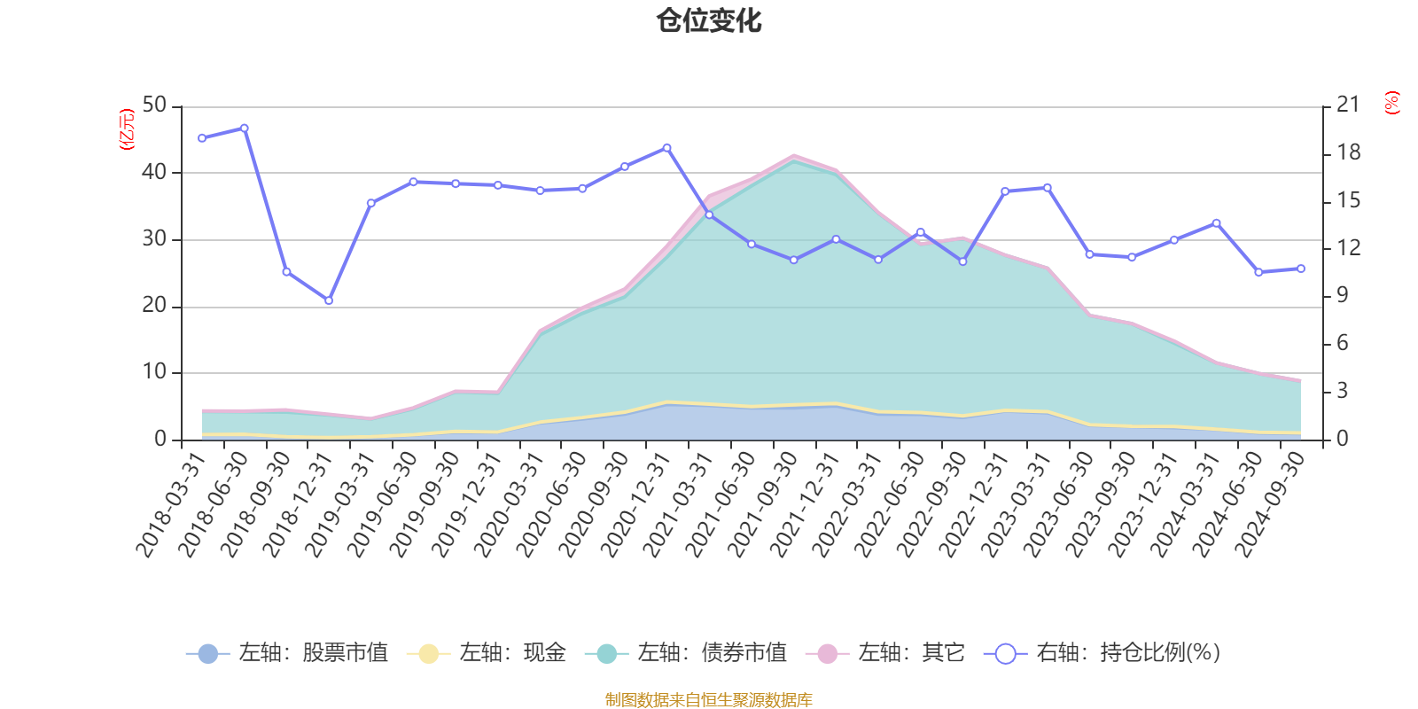 据定期报告数据统计,近三年平均股票仓位为12.55%,同类平均为18.66%。2018年上半年末基金达到19.63%的最高仓位,2018年末最低,为8.78%。