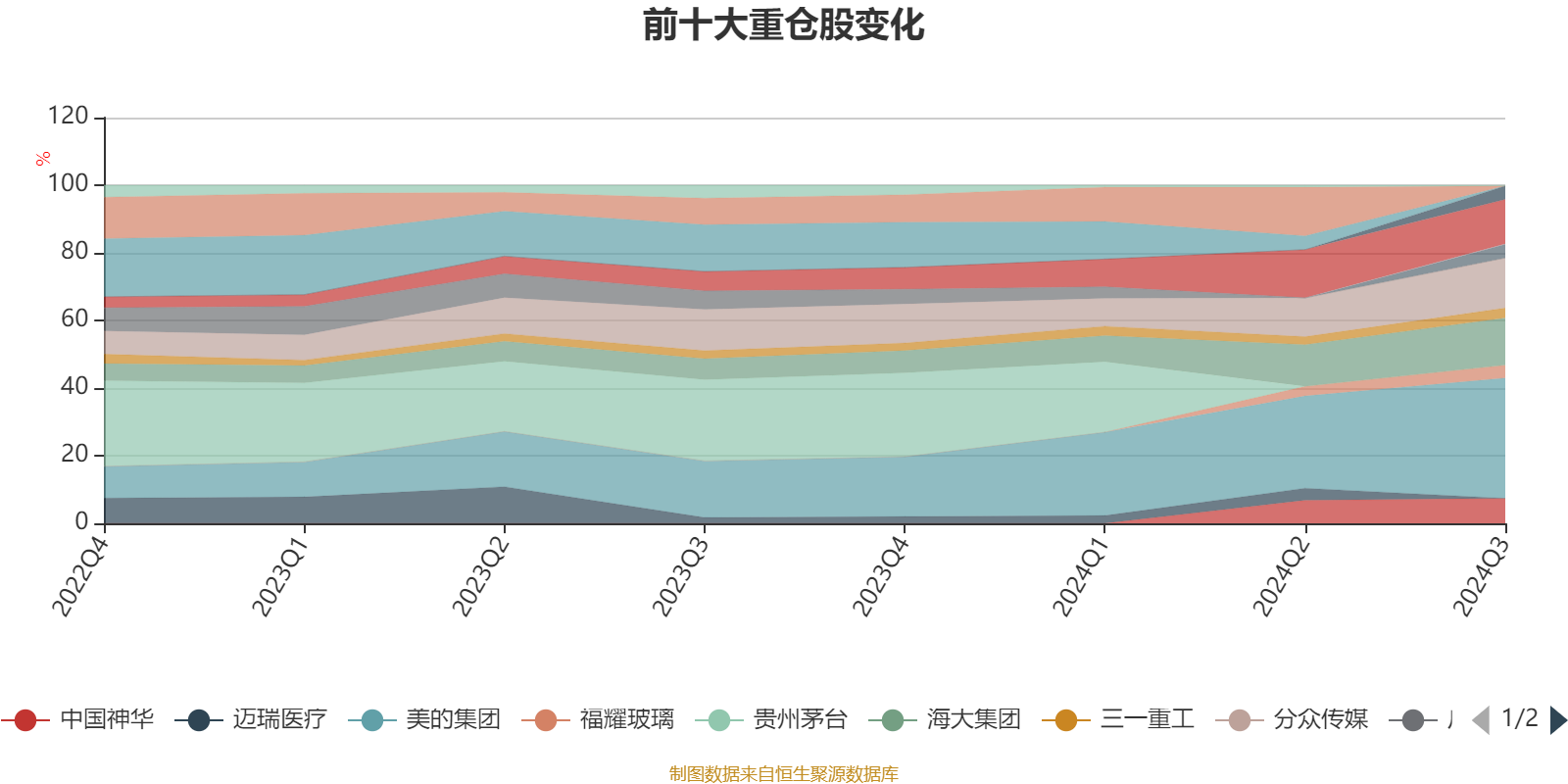 该基金持股集中度较高,且持股标的较为稳定,近2年前十大重仓股集中度长期超过60%。截至2024年三季度末,基金十大重仓股分别是美的集团、分众传媒、海大集团、长江电力、中国神华、格力电器、陕西煤业、福耀玻璃、三一重工、达梦数据。