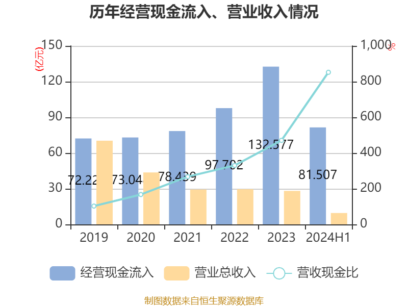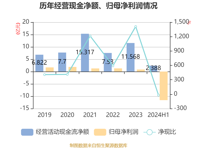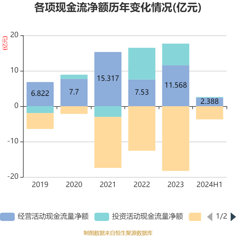 2024年上半年,公司经营活动现金流净额为2.39亿元,同比下降70.57%;筹资活动现金流净额-3.72亿元,同比增加8.07亿元;投资活动现金流净额2170.86万元,上年同期为4.43亿元。