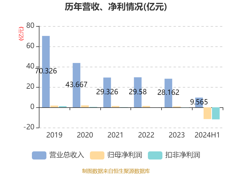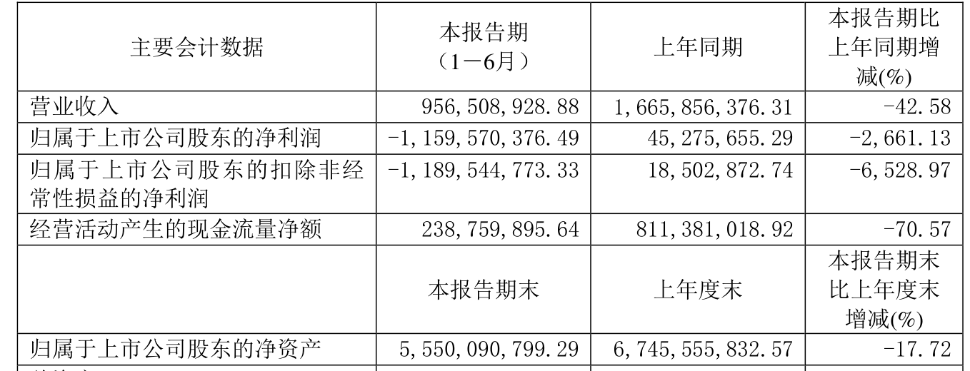 中证智能财讯 ST锦港(600190)11月1日披露2024年半年度报告。2024年上半年,公司实现营业收入9.57亿元,同比下降42.58%;归母净利润亏损11.6亿元,上年同期盈利4527.57万元;扣非净利润亏损11.9亿元,上年同期盈利1850.29万元;经营活动产生的现金流量净额为2.39亿元,同比下降70.57%;报告期内,ST锦港基本每股收益为-0.5791元,加权平均净资产收益率为-18.81%。