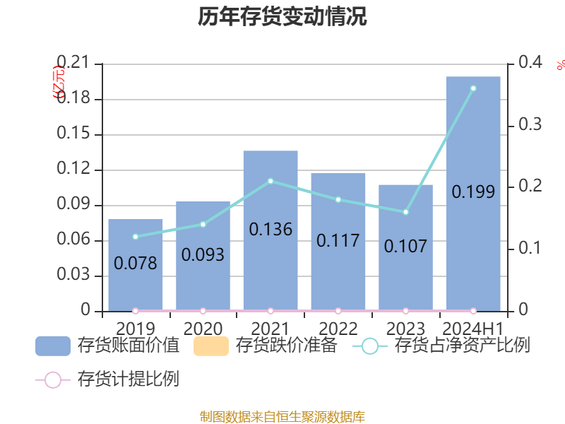 从存货变动来看,截至2024年上半年末,公司存货账面价值为1994.77万元,占净资产的0.36%,较上年末增加920.05万元。公司本期没有计提存货跌价准备。
