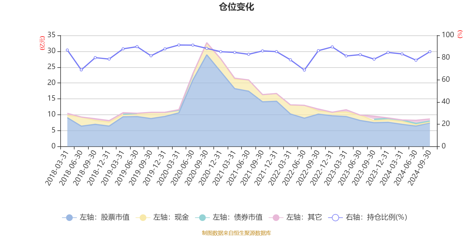 据定期报告数据统计,近三年平均股票仓位为81.82%,同类平均为85.67%。2020年一季度末基金达到91.36%的最高仓位,2022年上半年末最低,为68.79%。