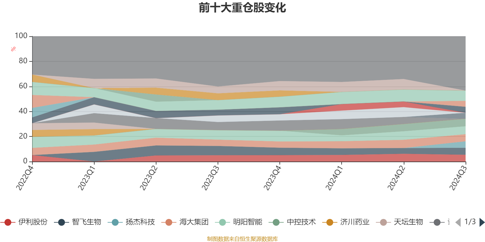 该基金持股集中度较高。截至2024年三季度末,基金十大重仓股分别是恒瑞医药、明阳智能、中控技术、海大集团、智飞生物、伊利股份、扬杰科技、恒生电子、长春高新、璞泰来。