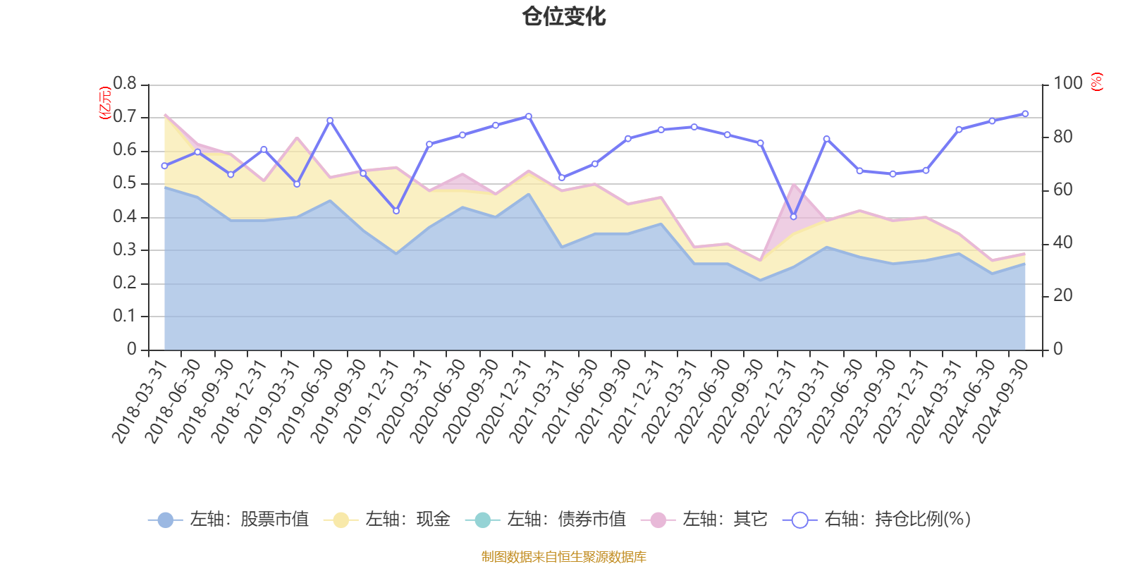 据定期报告数据统计,近三年平均股票仓位为76.32%,同类平均为79.69%。2024年三季度末基金达到89.03%的最高仓位,2022年末最低,为50.23%。