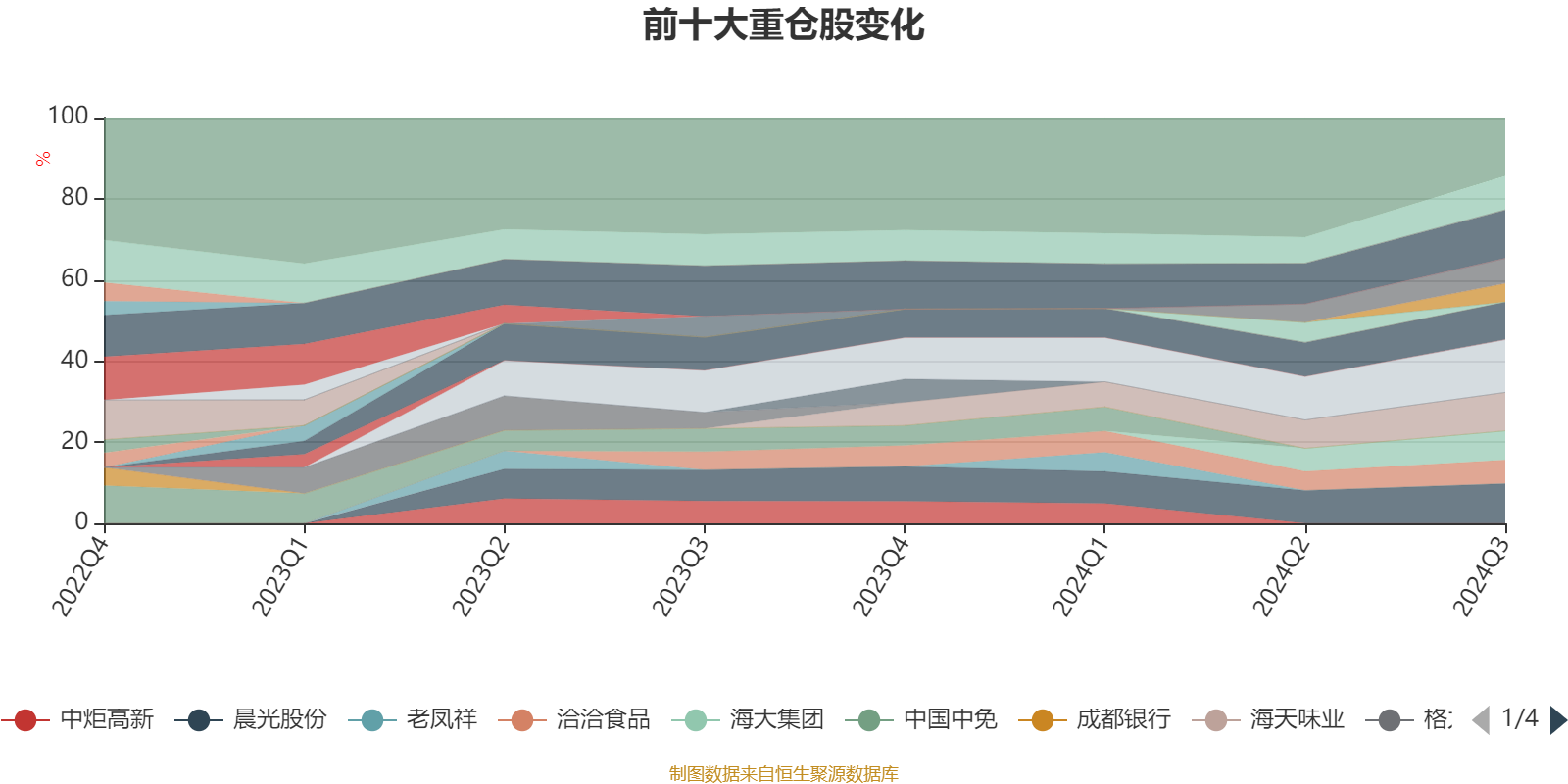 该基金持股集中度较高,近2年前十大重仓股集中度长期超过60%。截至2024年三季度末,基金十大重仓股分别是青岛啤酒、贵州茅台、晨光股份、海天味业、伟星新材、五粮液、海大集团、德邦股份、洽洽食品、中通快递-W。