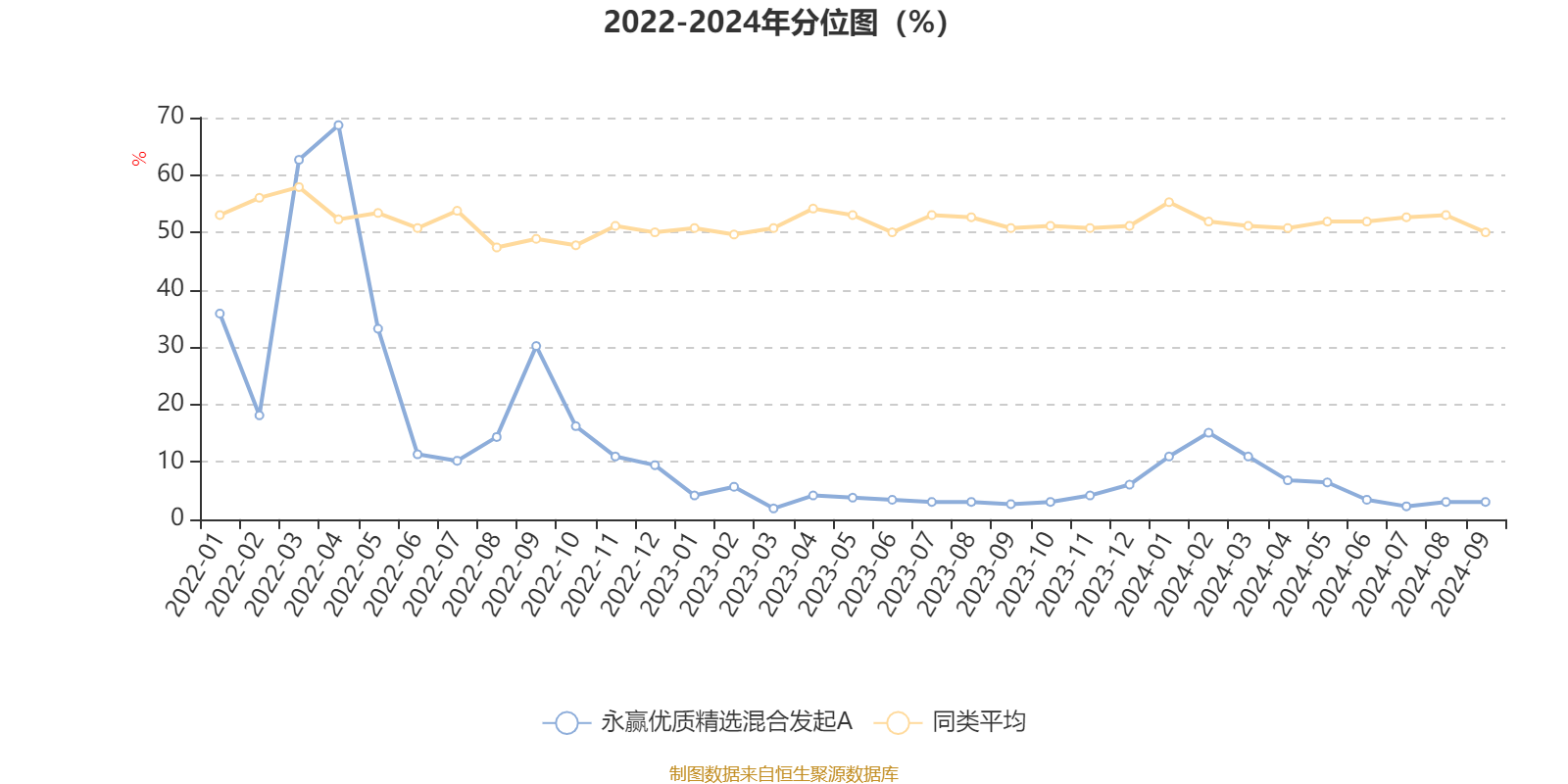 通过所选区间该基金净值增长率分位图,可以观察该基金与同类基金业绩比较情况。图为坐标原点到区间内某时点的净值增长率在同类基金中的分位数。