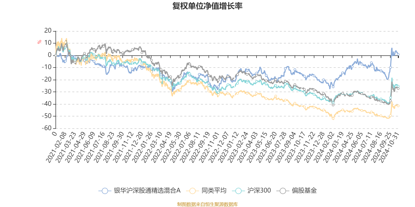 截至10月31日,银华沪深股通精选混合A近三个月复权单位净值增长率为11.37%,位于同类可比基金281/536;近半年复权单位净值增长率为9.31%,位于同类可比基金153/535;近一年复权单位净值增长率为21.10%,位于同类可比基金19/469;近三年复权单位净值增长率为16.35%,位于同类可比基金1/239。