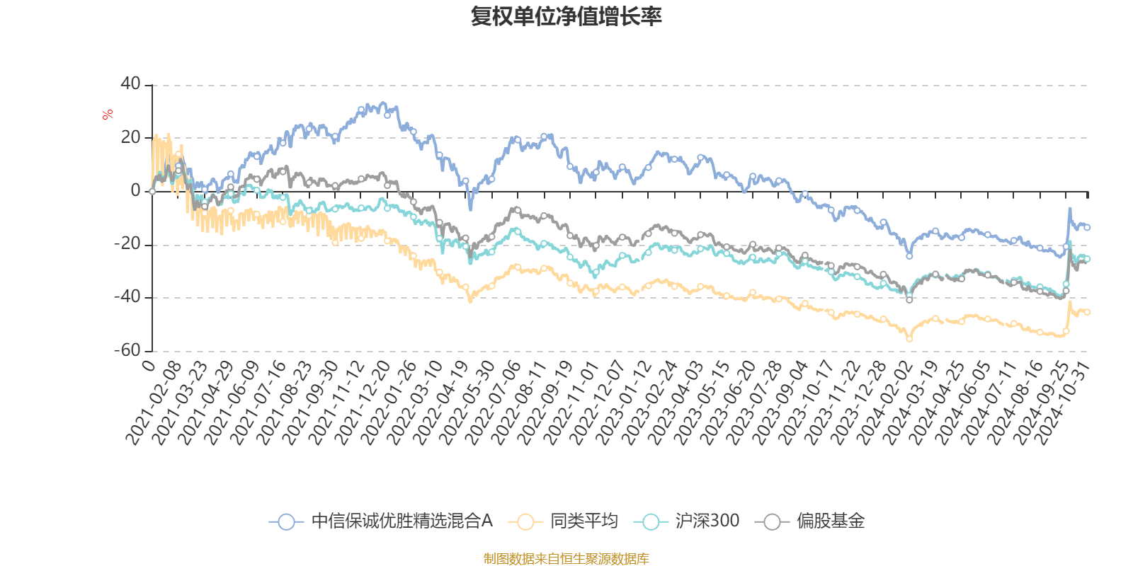 截至10月31日,中信保诚优胜精选混合A近三个月复权单位净值增长率为6.24%,位于同类可比基金175/211;近半年复权单位净值增长率为2.43%,位于同类可比基金118/211;近一年复权单位净值增长率为-6.23%,位于同类可比基金178/211;近三年复权单位净值增长率为-32.19%,位于同类可比基金100/181。