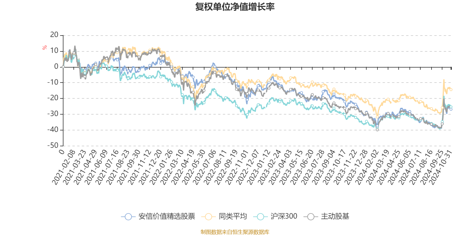截至10月31日,安信价值精选股票近三个月复权单位净值增长率为10.22%,位于同类可比基金43/74;近半年复权单位净值增长率为1.72%,位于同类可比基金57/74;近一年复权单位净值增长率为-5.00%,位于同类可比基金64/74;近三年复权单位净值增长率为-26.07%,位于同类可比基金40/71。