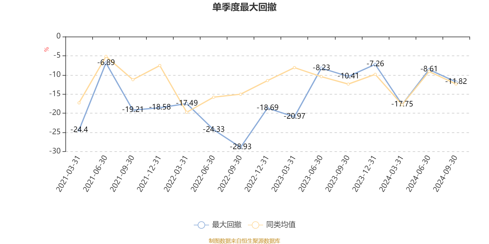 截至10月31日,基金近三年最大回撤为54.53%,同类可比基金排名15/72。其中,单季度最大回撤出现在2022年三季度,为28.93%。