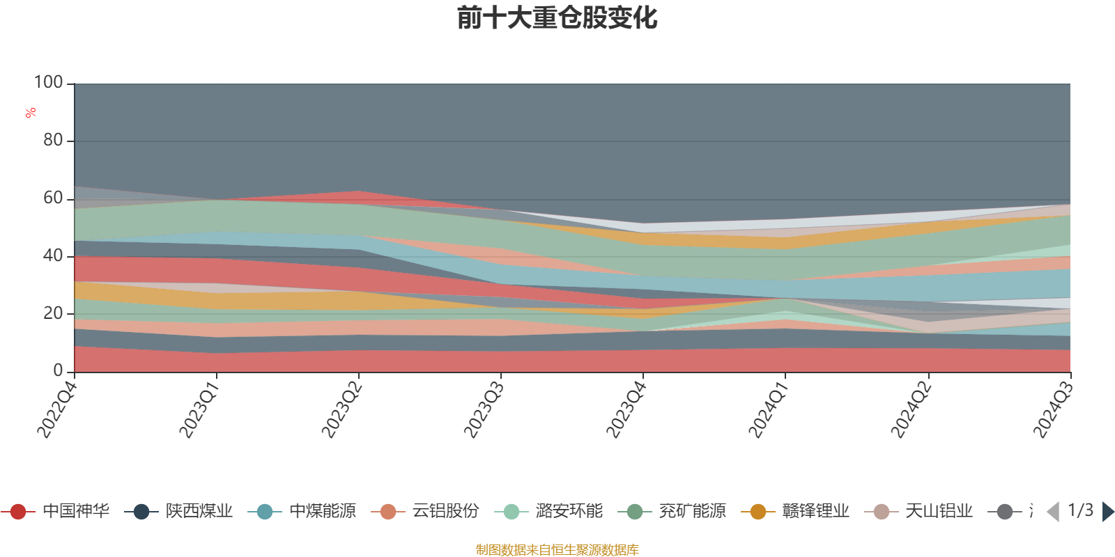 该基金持股集中度较高。截至2024年三季度末,基金十大重仓股分别是紫金矿业、洛阳钼业、中国神华、陕西煤业、中煤能源、天山铝业、中国铝业、金诚信、西部矿业、赤峰黄金。