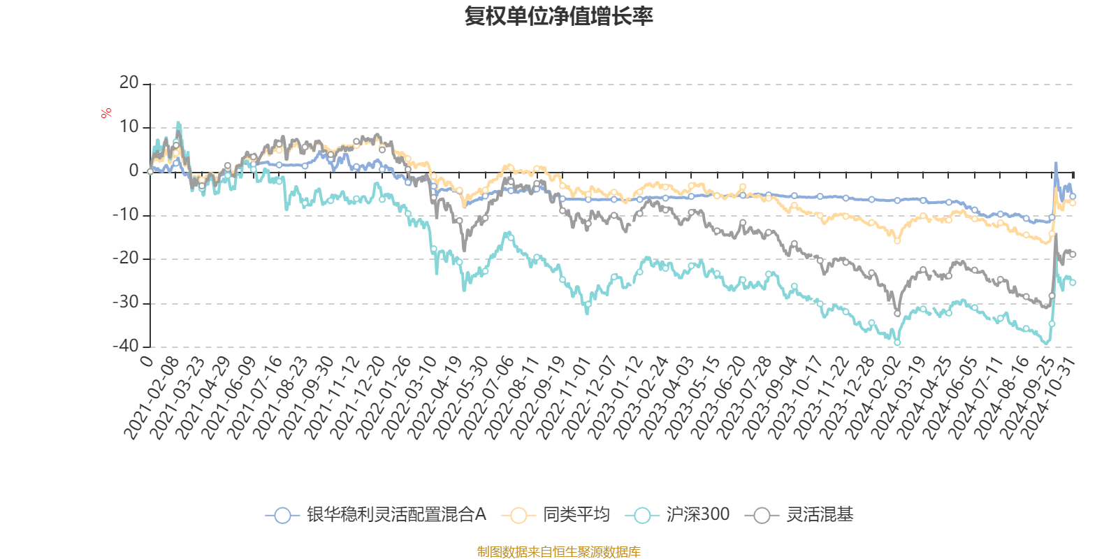 截至10月31日,银华稳利灵活配置混合A近三个月复权单位净值增长率为4.59%,位于同类可比基金49/108;近半年复权单位净值增长率为1.46%,位于同类可比基金61/108;近一年复权单位净值增长率为0.09%,位于同类可比基金72/108;近三年复权单位净值增长率为-9.34%,位于同类可比基金61/107。