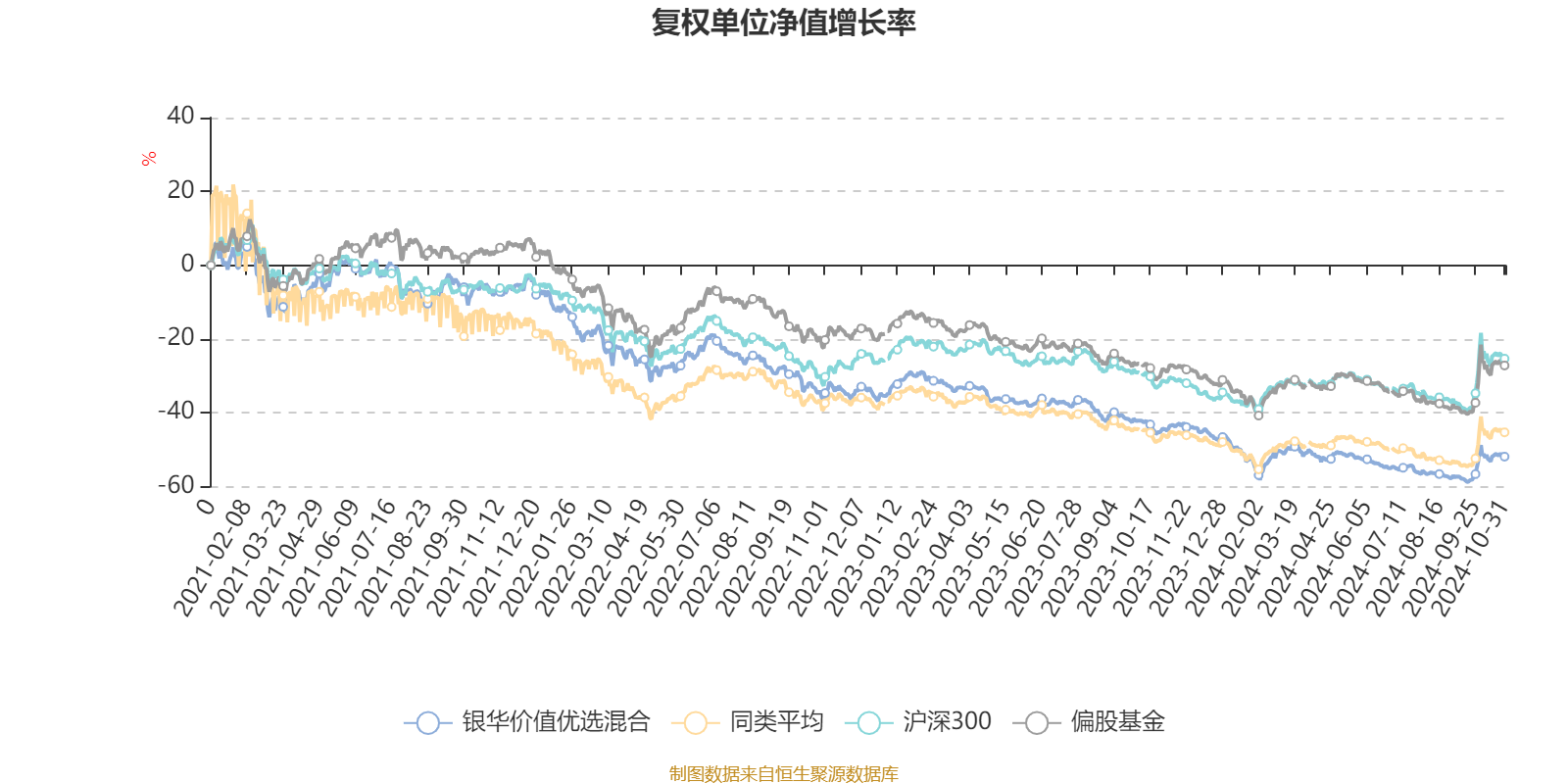 截至10月31日,银华价值优选混合近三个月复权单位净值增长率为8.49%,位于同类可比基金147/211;近半年复权单位净值增长率为-1.25%,位于同类可比基金166/211;近一年复权单位净值增长率为-13.35%,位于同类可比基金204/211;近三年复权单位净值增长率为-49.32%,位于同类可比基金170/181。